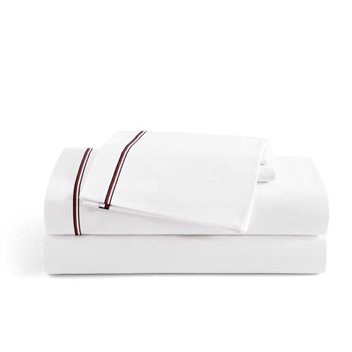 Tommy Hilfiger – lakanset, bomull percale sängkläder med matchande örngott, krispigt och svalt, premium kvalitet hem nödvändigheter (Global Stripe röd, drottning)