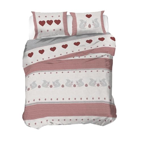 PENSIERI DELICATI Parure Påslakan Dubbelt Flanell 100% Bomull, Påse 250X200 CM och örngott 52X82 CM, Tillverkad i Italien, 40° Maskintvättbart påslakan, Mönster Röd Ekorre
