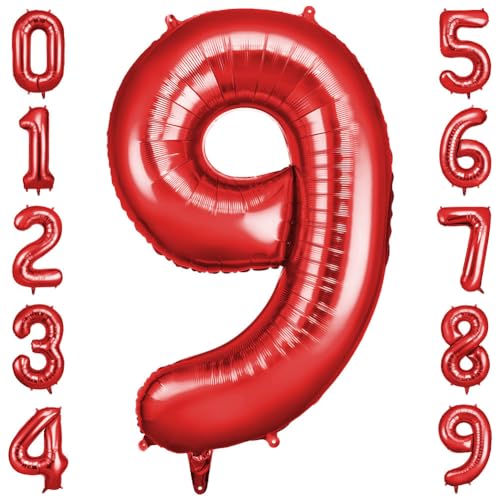 OFFCUP Jätte nummerballong, röda folieballonger nummer "9", 101,6 cm, dekoration för barnfödelsedag, för pojke eller flicka, med "Grattis på födelsedagen"-klistermärke