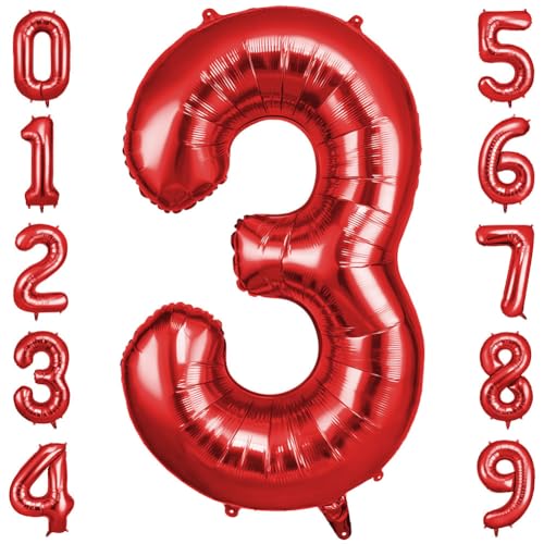 OFFCUP Jätte nummerballong, röda folieballonger nummer "3", 101,6 cm, dekoration för barnfödelsedag, för pojke eller flicka, med "Grattis på födelsedagen"-klistermärke