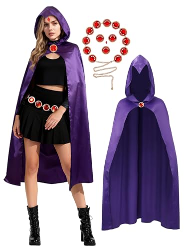 stepsin Kvinnor Titans-Raven Cosplay Kostym Deluxe Jumpsuit Kappa med huva outfit och röda stenar Kedja för Halloween kostym