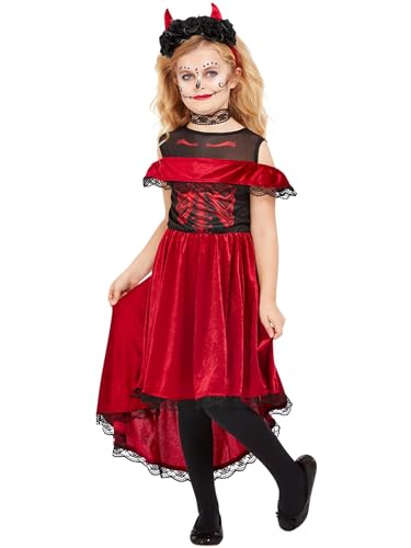 Smiffys DOTD djävulskostym, röd klänning och pannband, halloween barn maskeradklänning, Day of the Dead Lady utklädningsdräkter