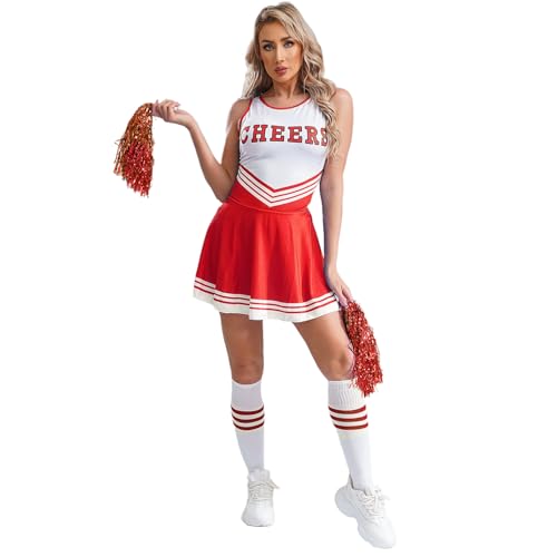 renvena dam cheer leader kostym set sexig miniklänning med pompoms strumpor karneval halloween karneval cosplay outfit party dans kostymer röd S
