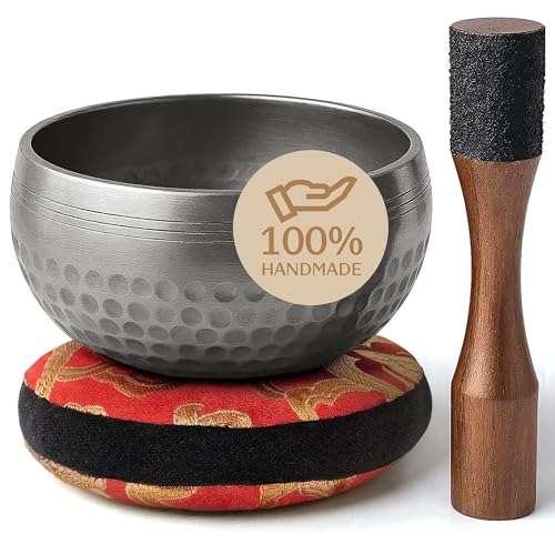 Tibetanskt klangskålset, lätt att spela med ny stav med dubbla ändar och kudde, skapar vackert ljud för holistisk helande, meditation och avkoppling, enkelhet, matt brun skål med röd kudde