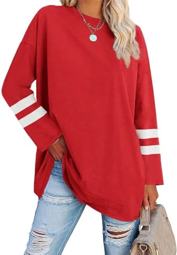 Ebifin oversize långärmad tröja dam lång tröja rund hals topp långärmad t-tröjor tröja basic tunika tetoppar., B-Röd, XL