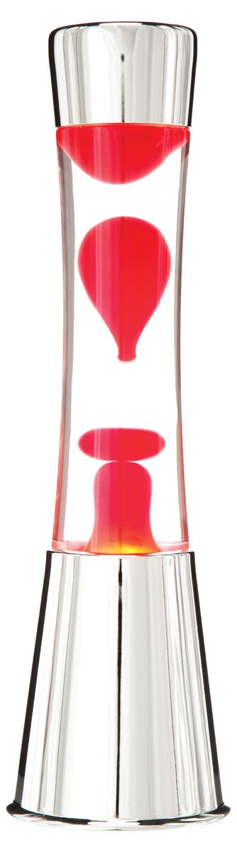 Fisura - Röd lavalampa med kromad bas, röd lava och genomskinlig vätska. Retrodesign med extra glödlampa, perfekt för att skapa en mysig atmosfär. Mått: 11,5 cm x 11,5 cm x 40 cm.