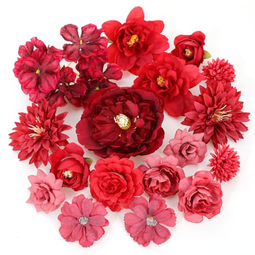 MWOOT 17 stycken konstgjorda blomhuvuden, falska blommor för dekoration, falska blandade kepsar, rosor pion falska näckrosor för gör-det-själv krona tårta brudbukett bröllop fest hem trädgård(röd)