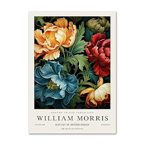William Morris Poster Vintage Väggkonst《Röd Orange Blå Pion》Utskrifter William Morris Canvasmålning Blomma Bild För Heminredning 40x60cm Oinramad