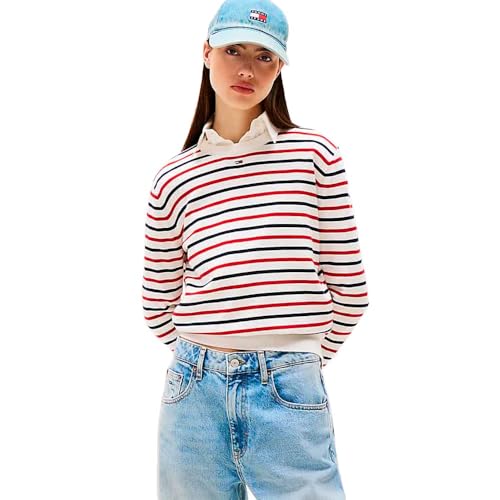 Tommy Jeans Dam TJW Essential Crew tröja EXT DW0DW20159 pullover tröja, vit (vit/röd/marinblå randig), 6XL, Vit (vit/röd/marinblå randig), 6XL stor