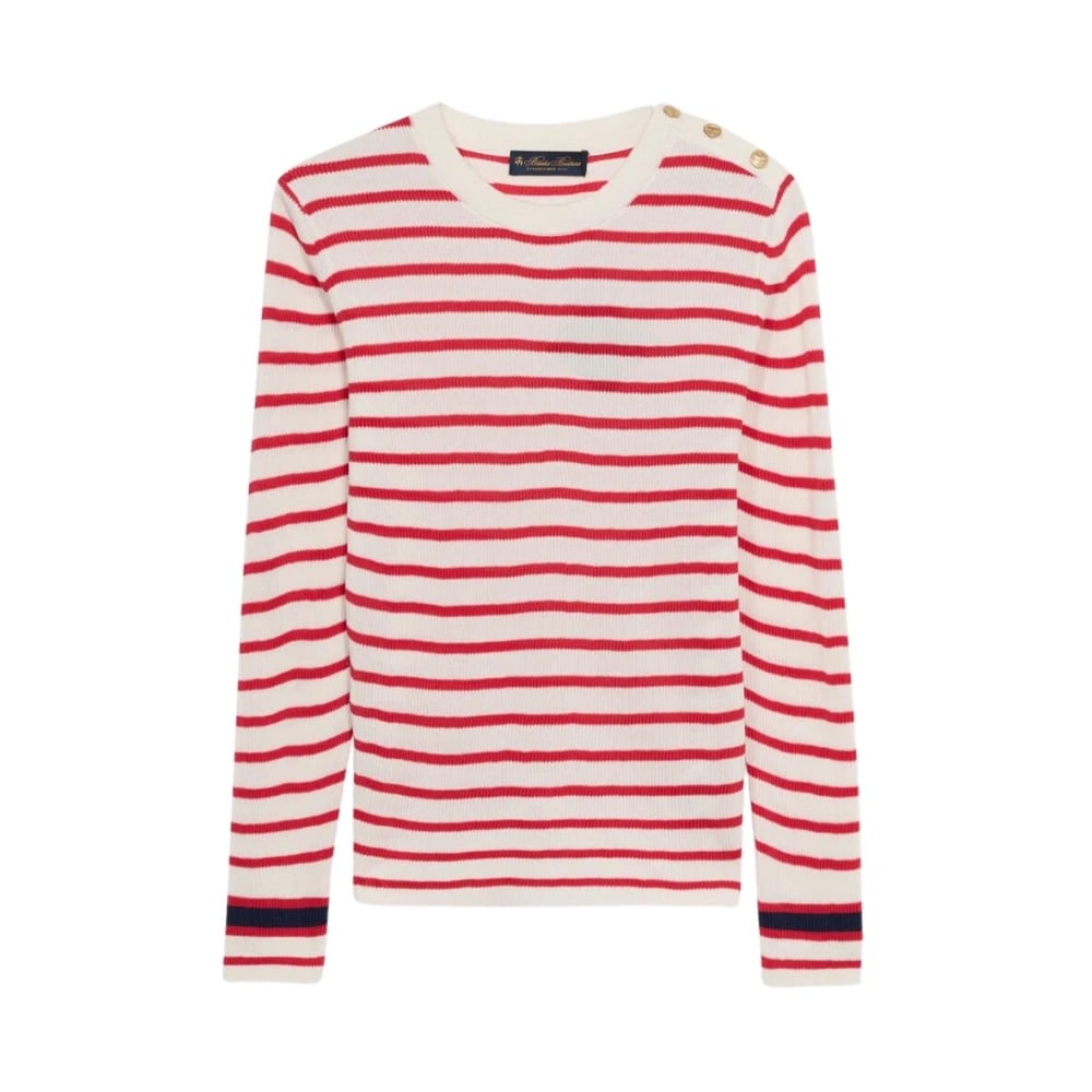 Brooks Brothers, Stickade Tröjor , Dam, M, Bomull, Randig tröja med rund hals och logotypguldknappar