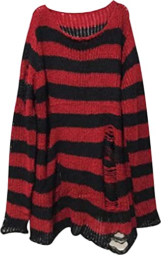 Y2K överdimensionerad gotisk punk rippad randig långärmad pullover tröja fe grunge bekymrad emo streetwear toppar kläder, Röd, one size