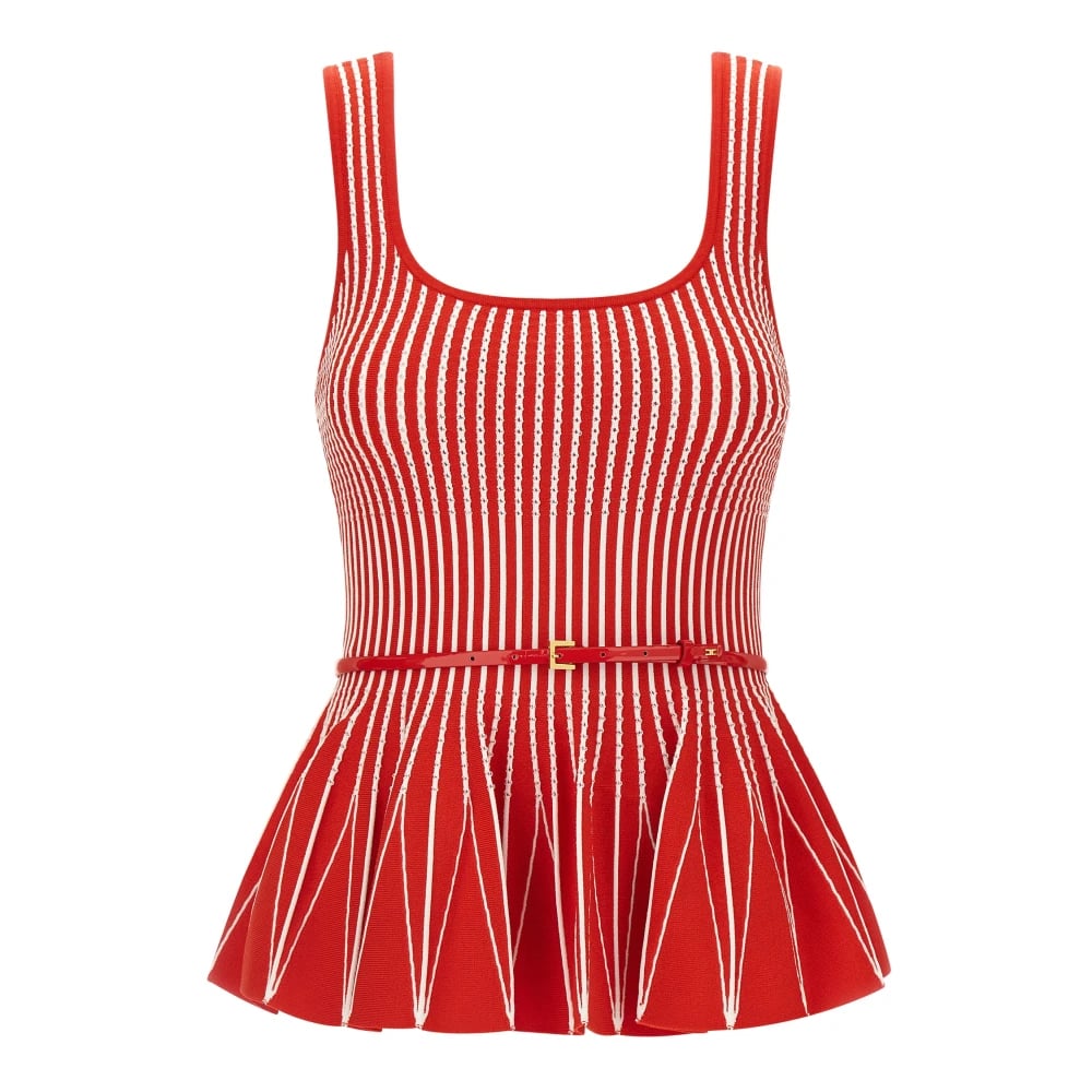 Elisabetta Franchi, Stickade Tröjor , Dam, M, Läder, Randig Tricot Topp i Viskosmix