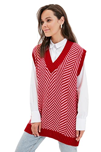 TRENDYOL Dam, v-ringad, randig, oversize, tröja, väst, tröja, röd, 36/38 SE