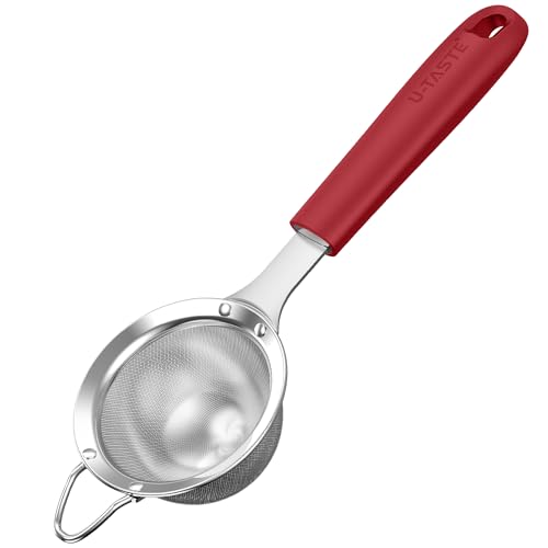U-Taste finmaskig sil: Kökssil av 18/8 rostfritt stål, liten metallsil med nitade, robust silikonhandtag för siktning av mjöl, dropp av te, ris, Quinoa (röd, 8,5 cm)