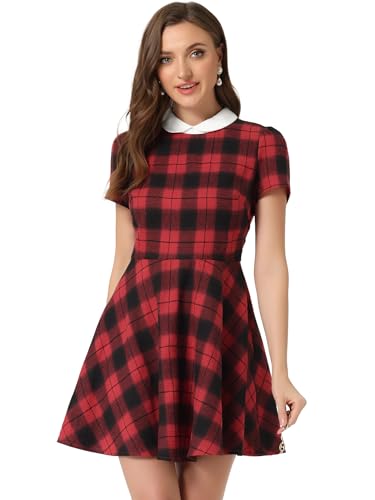 Allegra K Klänning för kvinnor, rutig med Peter Pan-krage och kontrast, julfestklänning med kort ärm och A-linjeform, Röd, S
