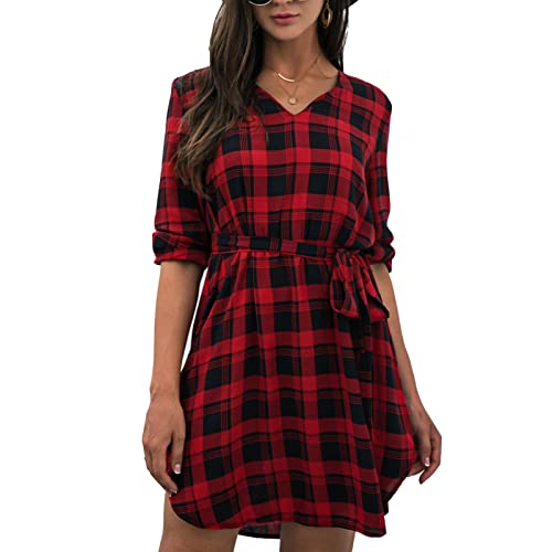 Dam blus V-hals långärmad rutig klänning tröja bälte kontorsklänning ett stycke höst klänning lös klänning lös klänning med bälte, Färg: röd, L, Kläder Dam Klänningar