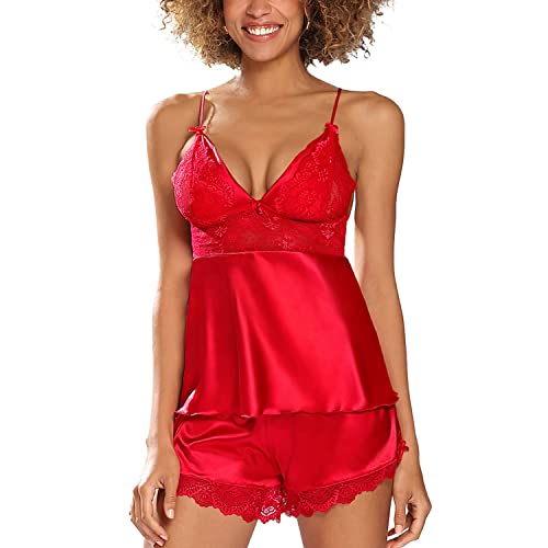 KALIMO Nattkläder, set för kvinnor, pyjamas av satin muna, röd, XL, röd, XL