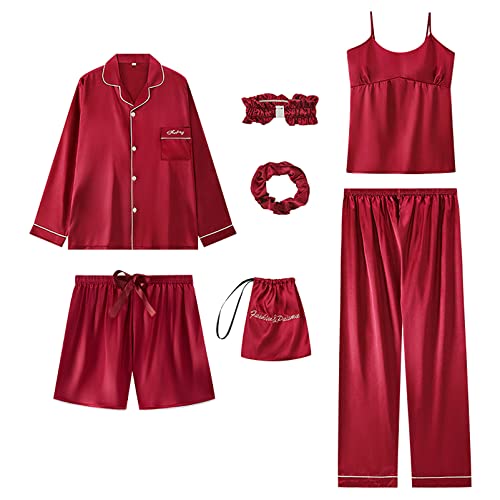 Jamron Kvinnor 7PCS Satin Pyjamas Set Vår Sommar Höst Toppar & Byxor Shorts Sömnkläder Röd SN07655 M