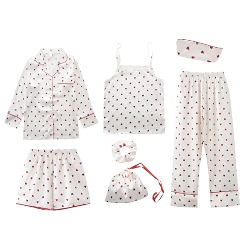 Jamron Flickor 7PCS Satin Pyjamas Set Vår Sommar Höst Toppar & Byxor Shorts Sömnkläder SN07655-2 Rött Hjärta 160CM
