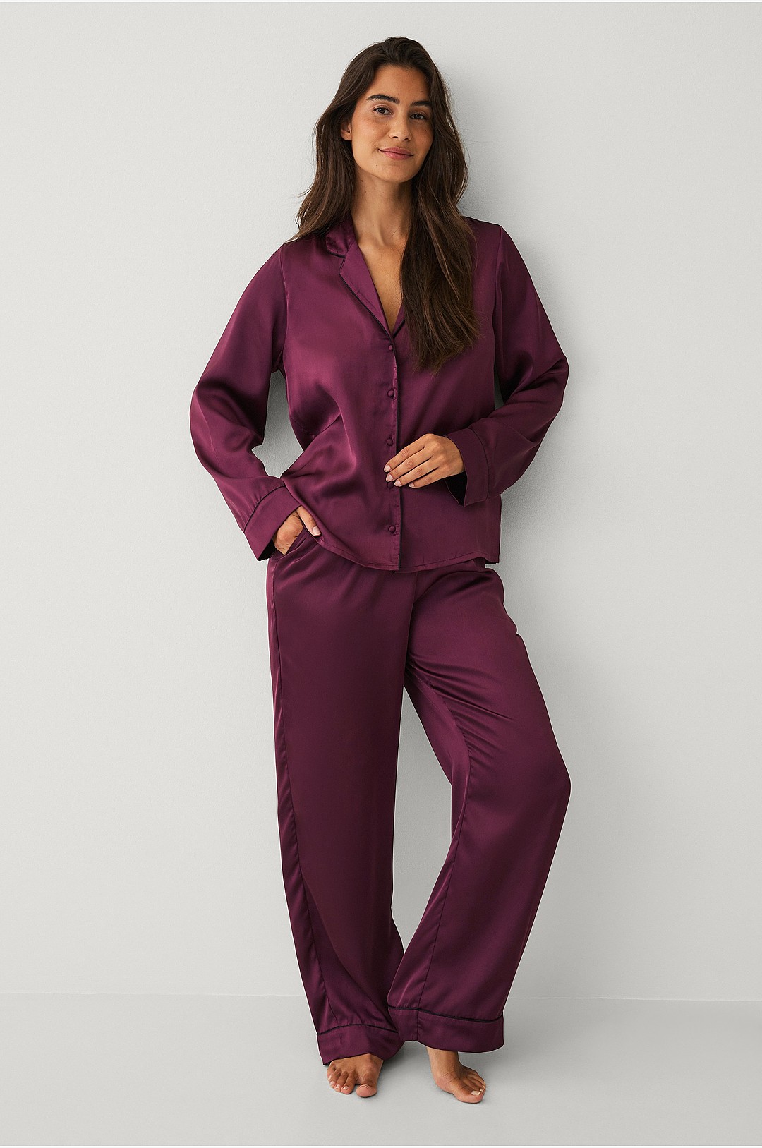 KALIMO Nattkläder, set för kvinnor, pyjamas av satin muna, vinröd, L, Vinröd, L