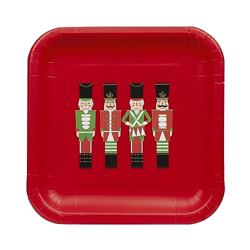 Nötknäpparen tema jul röd fyrkantig papperstallrikar stark känsla engångsbruk jul serveringsfat återvinningsbara servis dekorationer | 12-pack | Storlek: 18 cm