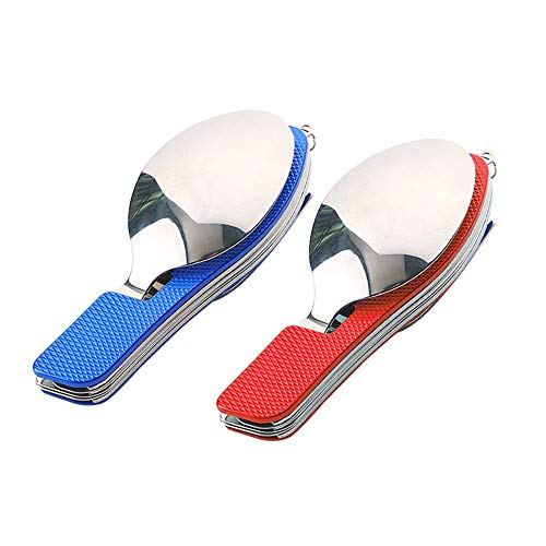 QitinDasen 2 st premium 4-i-1 vikbart bestick, avtagbar 4-i-1 hopfällbar servis, rostfritt stål hopfällbar camping bestick kniv gaffelsked och flasköppnare (röd + blå)