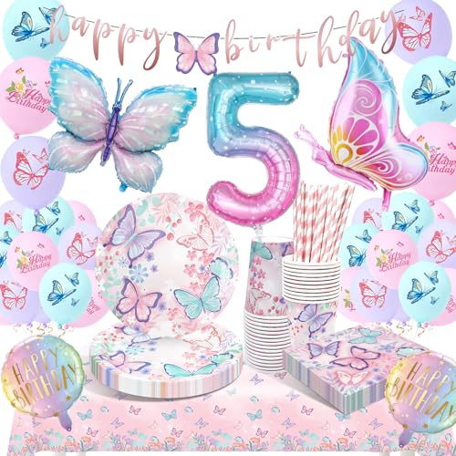 HLEIUKT Fjäril födelsedagsdekorationer för flickor, 5 år gammal fjäril födelsedag servis kit, ballong för 5 år fest dekoration (16 gäster)
