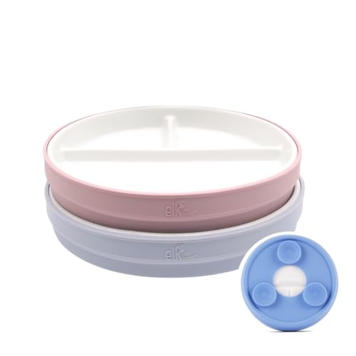 Älg och vänner barn 17 cm porslin vita delade tallrikar med silikon sughylsor | lämplig för bebisar/småbarn | mikrovågsugns- och diskmaskinssäker | lägg på servis | mellanmålsrätter | 2-pack
