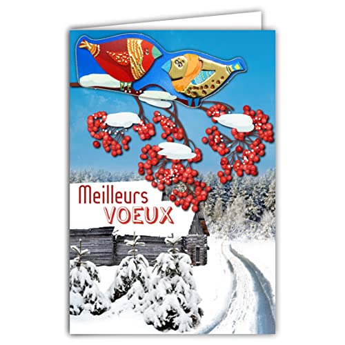 Afie 61-6003 kort med kuvert och limning i blankt guld fåglar önskar ett gott nytt år visa upp sina bästa röd-behå gren röda bär kaleter under snö