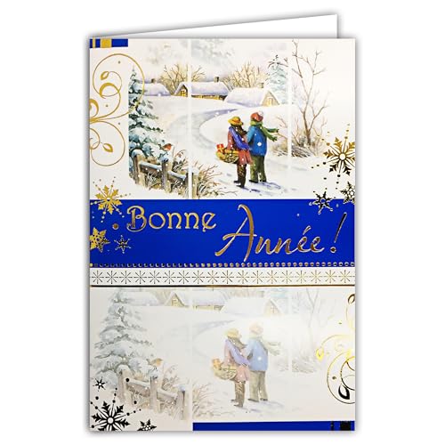 61-3011-2 blått Gott årskort med guld glänsande barn by snö flinga fågel röd hals granar - format 17 x 11,5 cm med kuvert