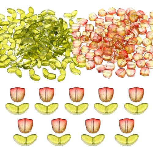 PATIKIL Tulpan blomma kristall glaspärlor, 200-pack blompärlor handgjorda glasdistanspärlor för smyckestillverkning armband örhänge, röd/grön