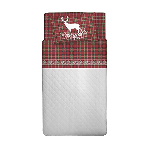 PENSIERI DELICATI Set med enkelsäng, flanell 100% varm och mjuk bomull, set med lakan 1 kvadrat 90 x 200 cm, inkluderar underlakan, över och 1 örngott, tillverkat i Italien, Tartan rådjur röd