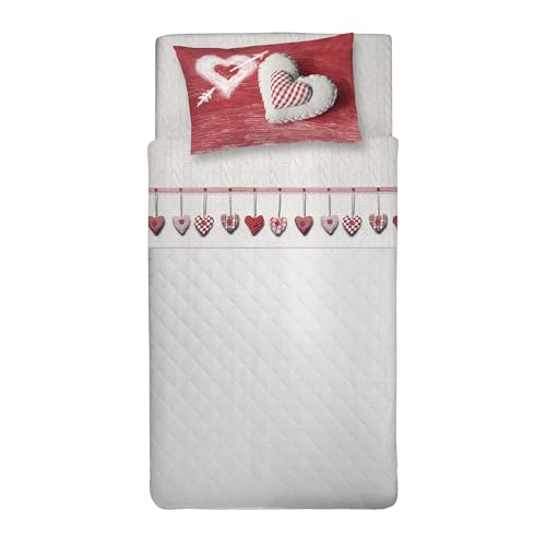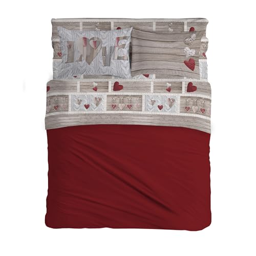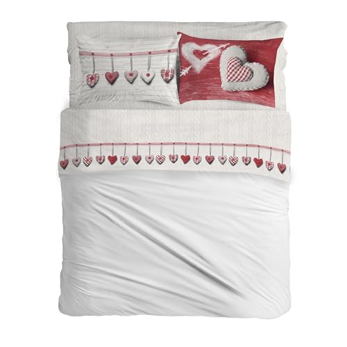 PENSIERI DELICATI Set med 1 mellanstor säng, flanell 100% varm och mjuk bomull, set med lakan 120 x 200 cm, inkluderar underlakan, över och 1 örngott, tillverkat i Italien, hjärta hängande röd