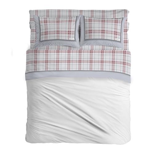 PENSIERI DELICATI Set för dubbelsäng, flanell 100% varm och mjuk bomull, 2 rutor 180 x 200 cm, inkluderar underlakan, över och 2 örngott, tillverkat i Italien, turin röd