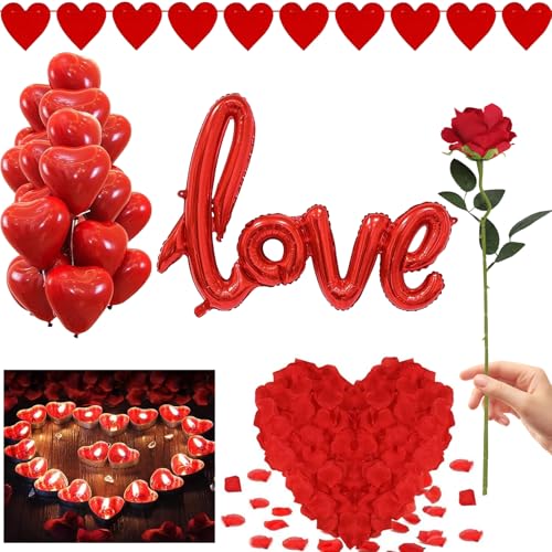 Romantiska ljus, röda värmeljus och rosenblad, romantiskt dekorationsset med 50 hjärtformade värmeljus, 1 000 röda rosenblad, en röd hjärtformad girlang, 20 hjärtformade ballonger, dekorationer för alla hjärtans dag