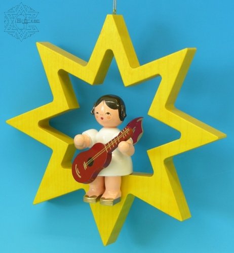 Original Erzgebirge Volkskunst - Sittande ängel med gitarr, Vingar Färg: Röd