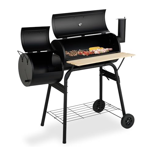 Relaxdays Grill Carbonella med hjul och hyllor, rökgrill med lock och termometer, stål, trä, svart, plast, 106 x 114 x 67 cm