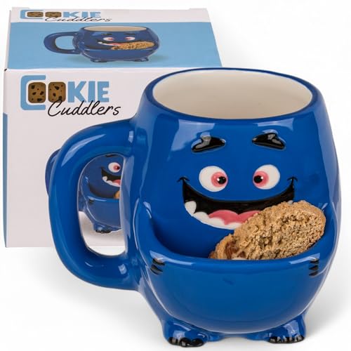 MIJOMA Mugg med handtag och kakfack – rolig mugg i Dolomit, 400 ml, original kaffemugg med snackfack, rolig souvenir för kex- och teälskare (monsterblå)
