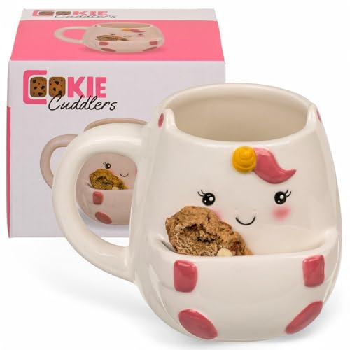 MIJOMA Mugg med handtag och kakfack – rolig mugg i Dolomit, 400 ml, original kaffemugg med snackfack, rolig souvenir för kex- och teälskare (enhörning)