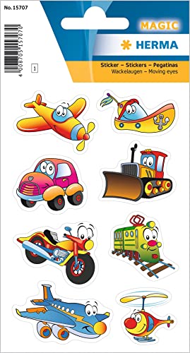 HERMA 15707 klistermärken fordon bil liten, 8 stycken, vinglande ögonklistermärken med roliga bil fartyg flygplan motorcykel tåg helikopter motiv, barnetiketter för fotoalbum scrapbooking