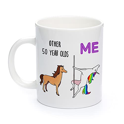 OMNIQI 50:e födelsedagspresenter för kvinnor, 325 ml 50 år gammal födelsedag nyhet kaffemugg för bästa vän mamma syster moster, roliga 50:e födelsedagsdekorationer femtio födelsedagspresenter för