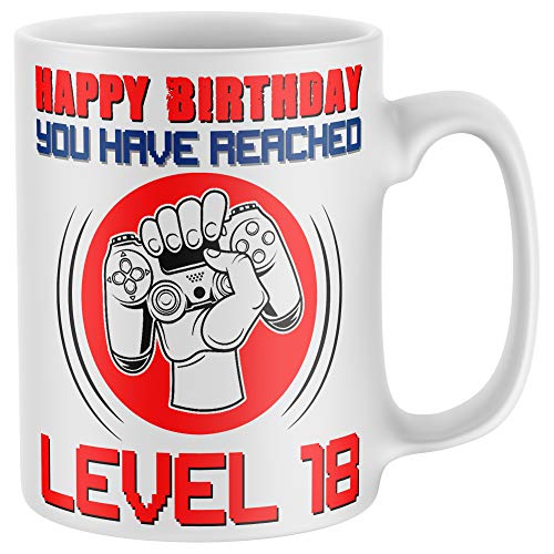 18-års födelsedagsmugg, nivå 18 nyhet spelgåvor för pojkar, videospel spelare roliga muggar tonåringar present, vit, en storlek