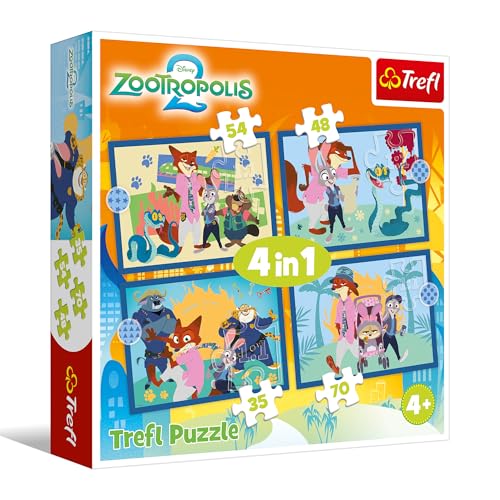 Trefl – Zootopia 2, Zootopia fullt av äventyr – 4-i-1-pussel, 4 pussel, 35 till 70 bitar – olika svårighetsgrader, färgglada pussel med sagofigurer, roligt för barn från 4 år