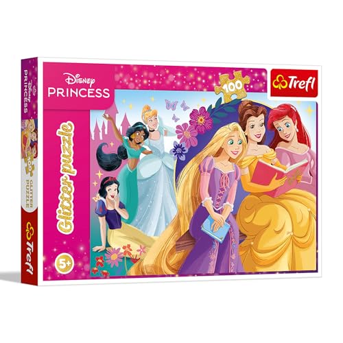 Trefl - Glitterpussel: Disney Princess, The Magic of Friendship - Glitterpussel 100 bitar - Ett glittrande pussel med sagofigurer, kreativ underhållning, roligt för barn från 5 år