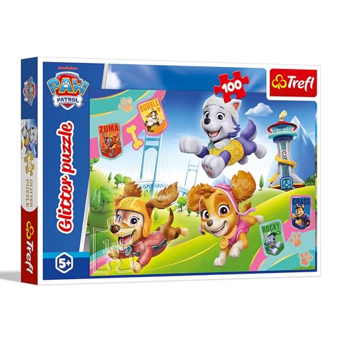 Trefl - Glitterpussel: Paw Patrol, Sparkling Dogs - Glitterpussel 100 bitar - Glittrande pussel med seriefigurer, kreativ underhållning, roligt för barn från 5 år