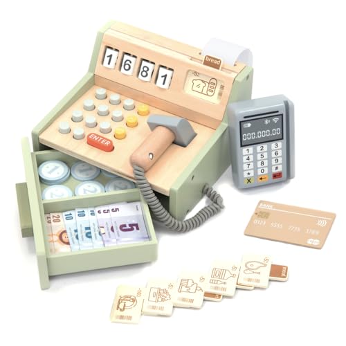 umu Barnkassa av trä – inklusive tillbehör (skanner, betalningsterminal, låspengar etc.), varubutiker och tillbehör för rollspel, spelkassa för barn från 3 4 5 6 år