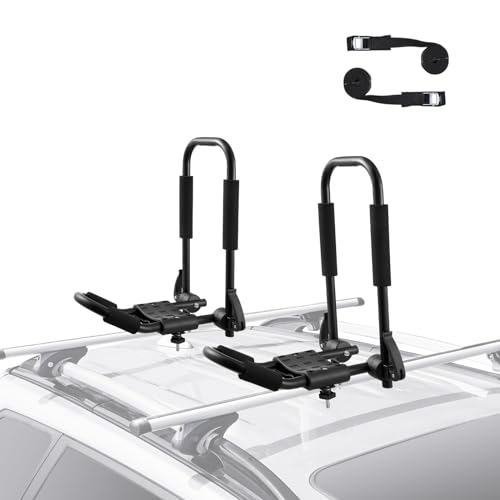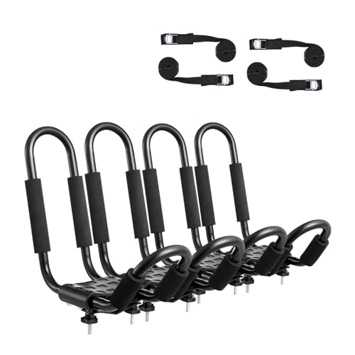 Leader Accessories Folding Kayak Rack 4 PCS/Set J Bar Car Roof Rack for Canoe Surf Board SUP On Roof Top Mount on SUV, Car and Truck Crossbar with 4 pcs Tie Down Straps