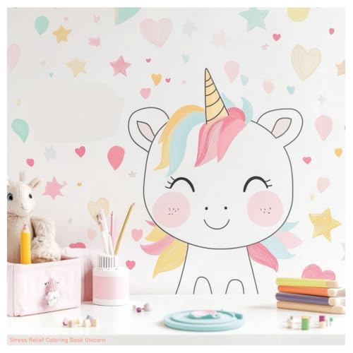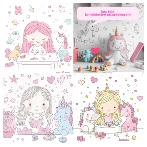 Stress Relief Easy Coloring Book: unicorn Cartoon-style, cute girl in pastel pink colors, children's wallpaper with small hearts and stars in the ... room decor, wall mural design, white table