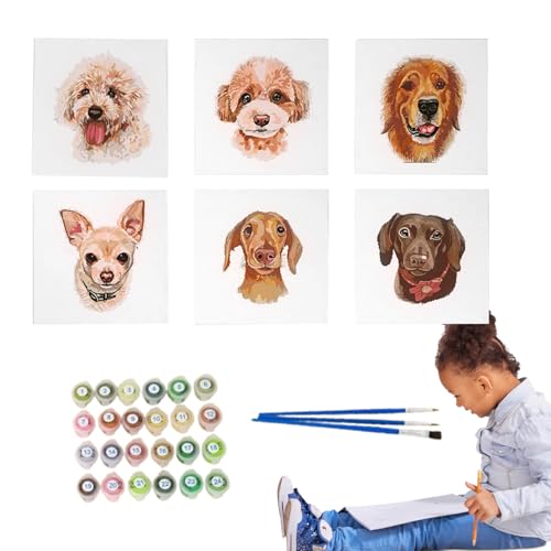 Paint by Numbers Dog Kit, 6 Pack Puppy Drawing Paintwork with Frame, Animal Painting Art Crafts Set for Kids and Adults, School, Classroom, Living Room Decor, 5.91x7.87 inches