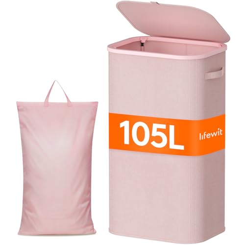 Lifewit Tvättkorg med lock, 100 l tvättkorg med plastram, vikbar stor tvättsorterare, tvättlåda, tvättkorgar för sovrum, badrum, rosa